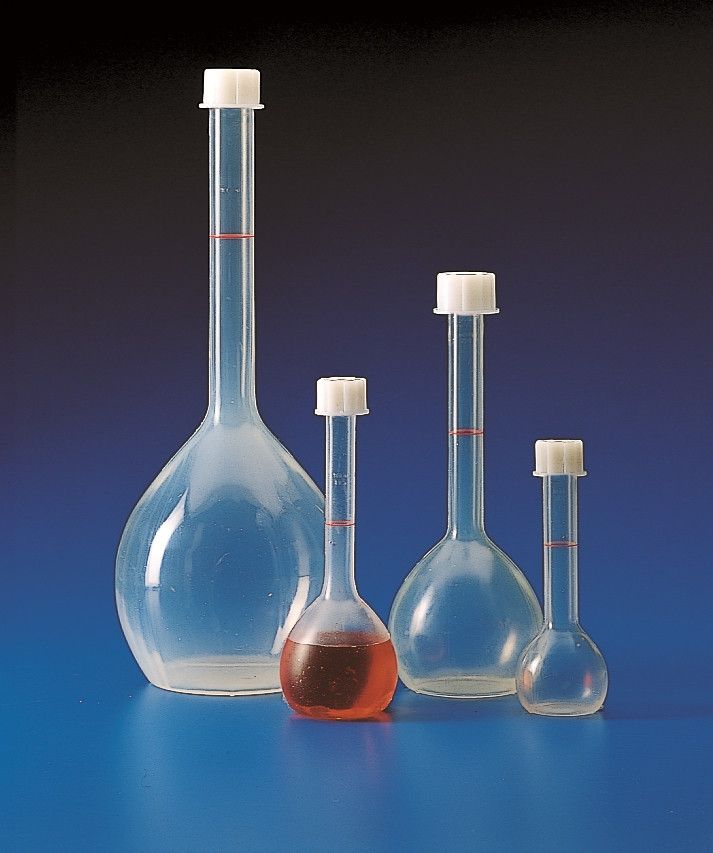 Műanyag mérőlombikok csavaros kupakkal, különféle méretekben.